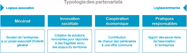 Il existe 1,2 million de partenariats en France. 53% des associations employeuses et 37% des entreprises développent des partenariats. Plus de la moitié sont mis en place au sein d’entreprises d’au moins dix salariés au travers d’une diversité de modes d’actions : pratiques responsables (42%), mécénat (30%), coopération économique (25%) et innovation sociétale (16%).